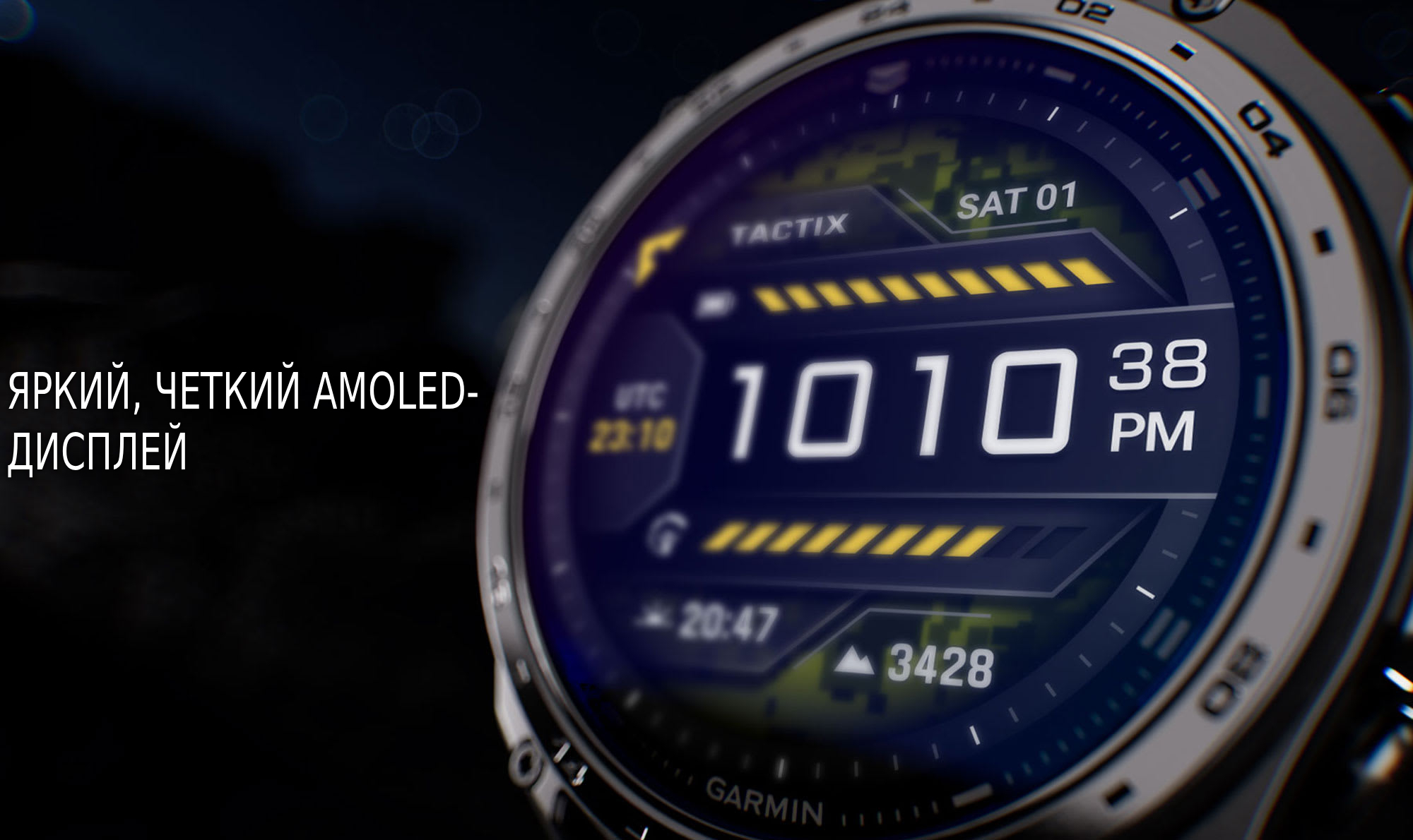 Поднимитесь на новый уровень с tactix 8. Это лучшие тактические смарт-часы с потрясающим дисплеем AMOLED, титановым безелем, сапфировым стеклом и возможностью погружения на глубину до 40 метров.
