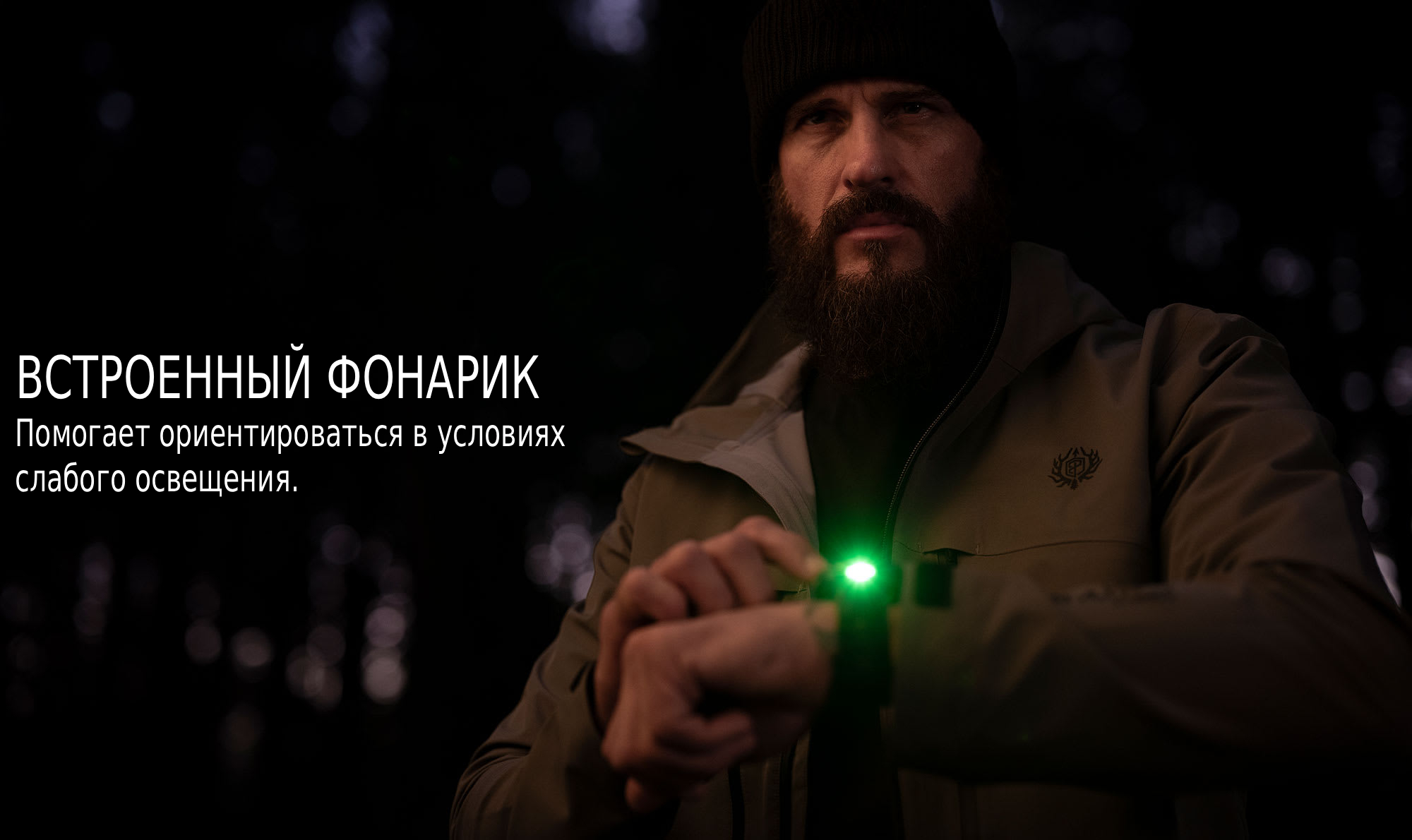Встроенный многоцветный светодиодный фонарик поможет вам ориентироваться в условиях низкой освещенности, обеспечивая быстрый доступ к яркому и ровному зелёному или белому свету. В режиме ночного видения белый свет отключается, а зелёный фонарик становится тусклым.