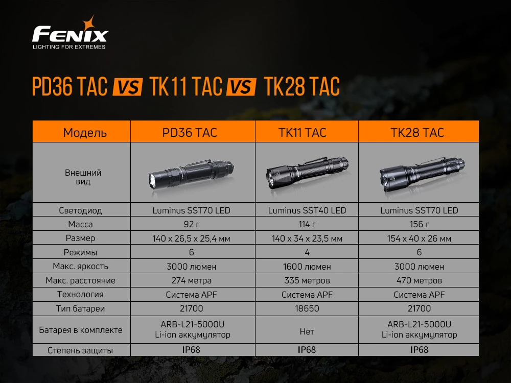 Фонарь модели Fenix PD36TAC является тактическим прибором, который пригодится вам в разных видах активного отдыха и туризма. Обеспечивает наибольший световой поток в 3000 люменов, а дальнобойность луча достигает 274 метров. Применённый светодиод – Luminus SST70. Срок службы такого светодиода достигает 50 тысяч часов. В комплекте вместе с фонарём предусмотрели литий-ионный аккумулятор 21700. Управление осуществляется через запатентованную двухфункциональную кнопку, которая производит мгновенную тактическую активацию.