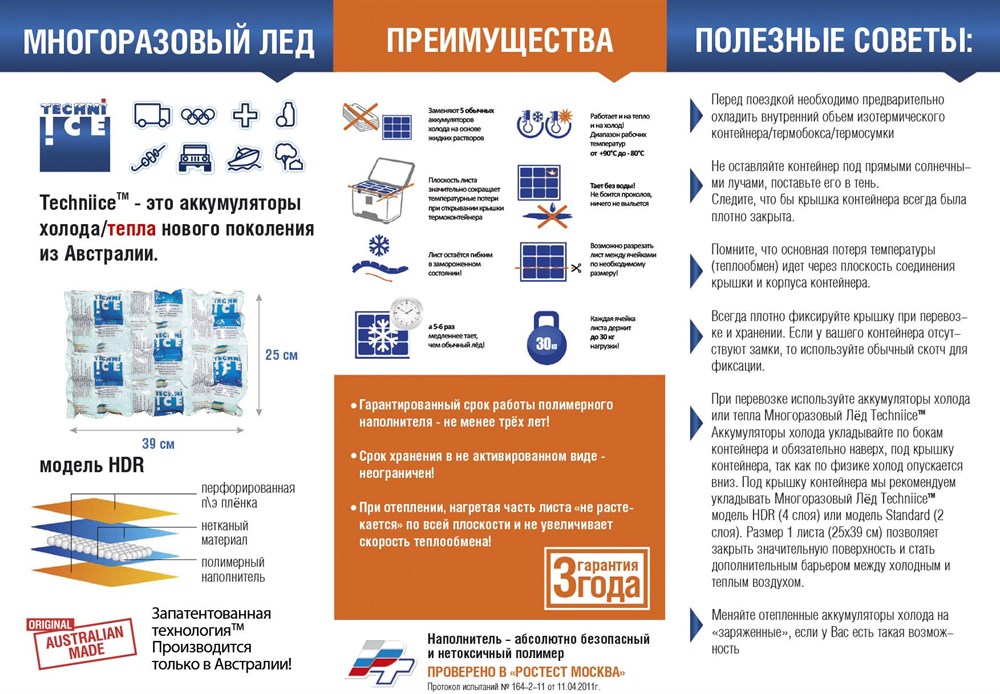 Многоразовый лед Techniice™ HDR состоит из полимерного наполнителя (хладагента), заключенного между двумя слоями нетканого материала и двумя наружными слоями высокопрочной полимерной пленки. Полимерный наполнитель (хладагент) обработан по специальной технологии, запатентованной во всем мире. В результате чего он приобретает уникальные свойства (высокая хладо- и теплоемкость, оптимальная скорость «таяния», т.е. отдачи холода/тепла). Лед остается гибким после заморозки, его можно разрезать на любые требуемые размеры (между ячейками). Им удобно обкладывать, оборачивать и т.д. Плюс относительно невысокая стоимость. Заменяет 5 обычных хладоэлементов. Минимальная стоимость в расчете на единицу веса хладагента. Все это делает многоразовый лед Techniice™ HDR лучшим по потребительским качествам среди аналогичной продукции.